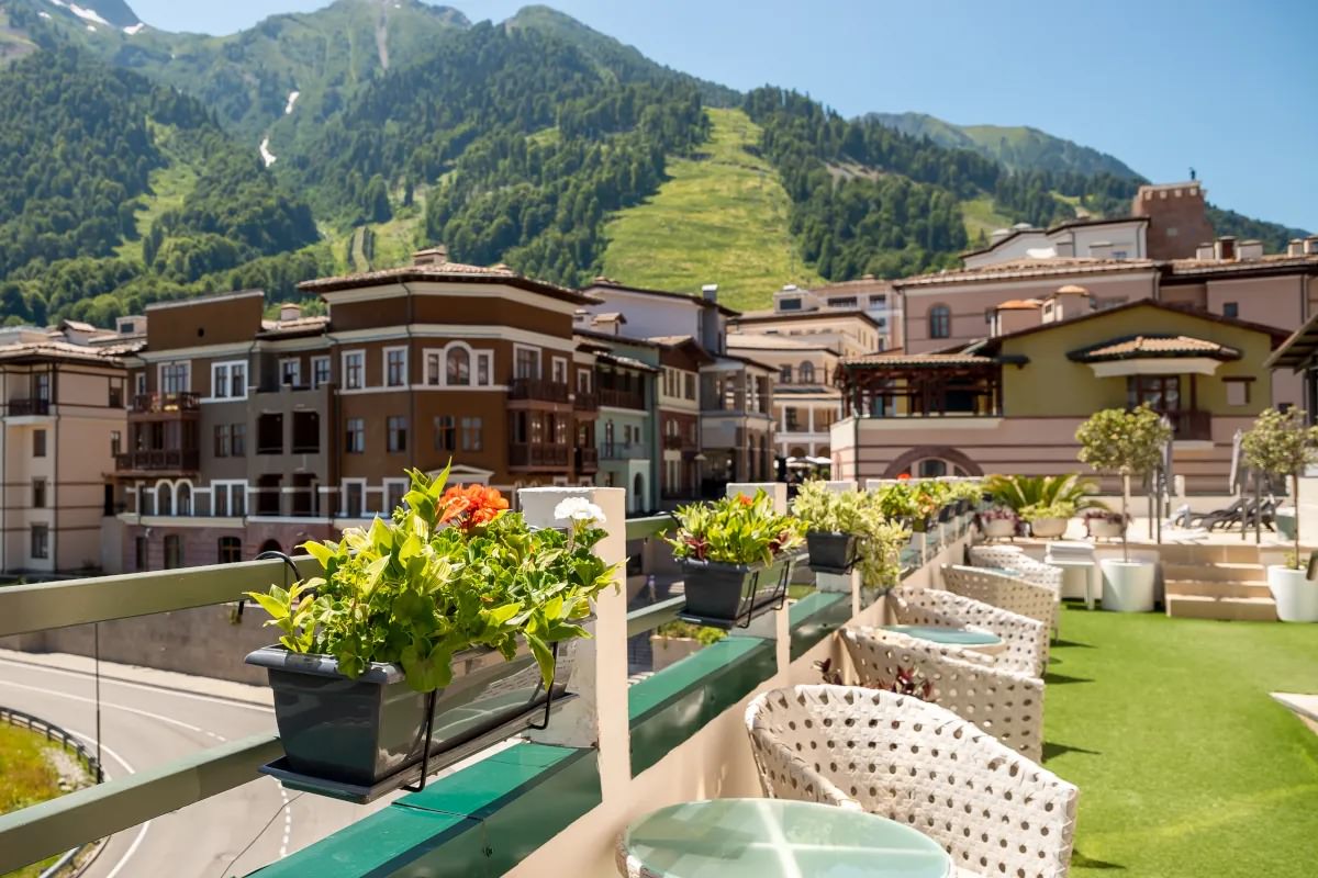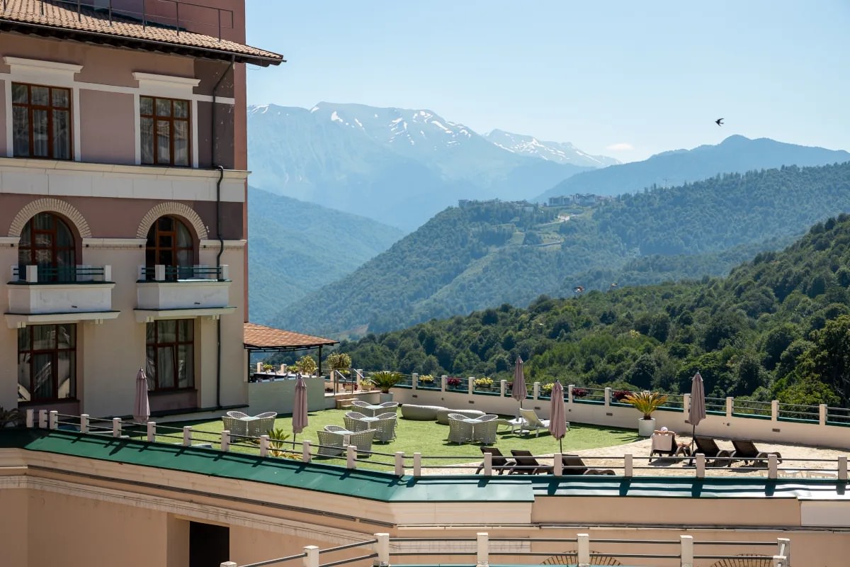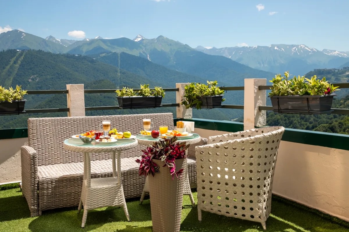 Уютная терраса, под открытым небом, где можно насладиться тишиной и видом на прекрасные горы Кавказского заповедника.