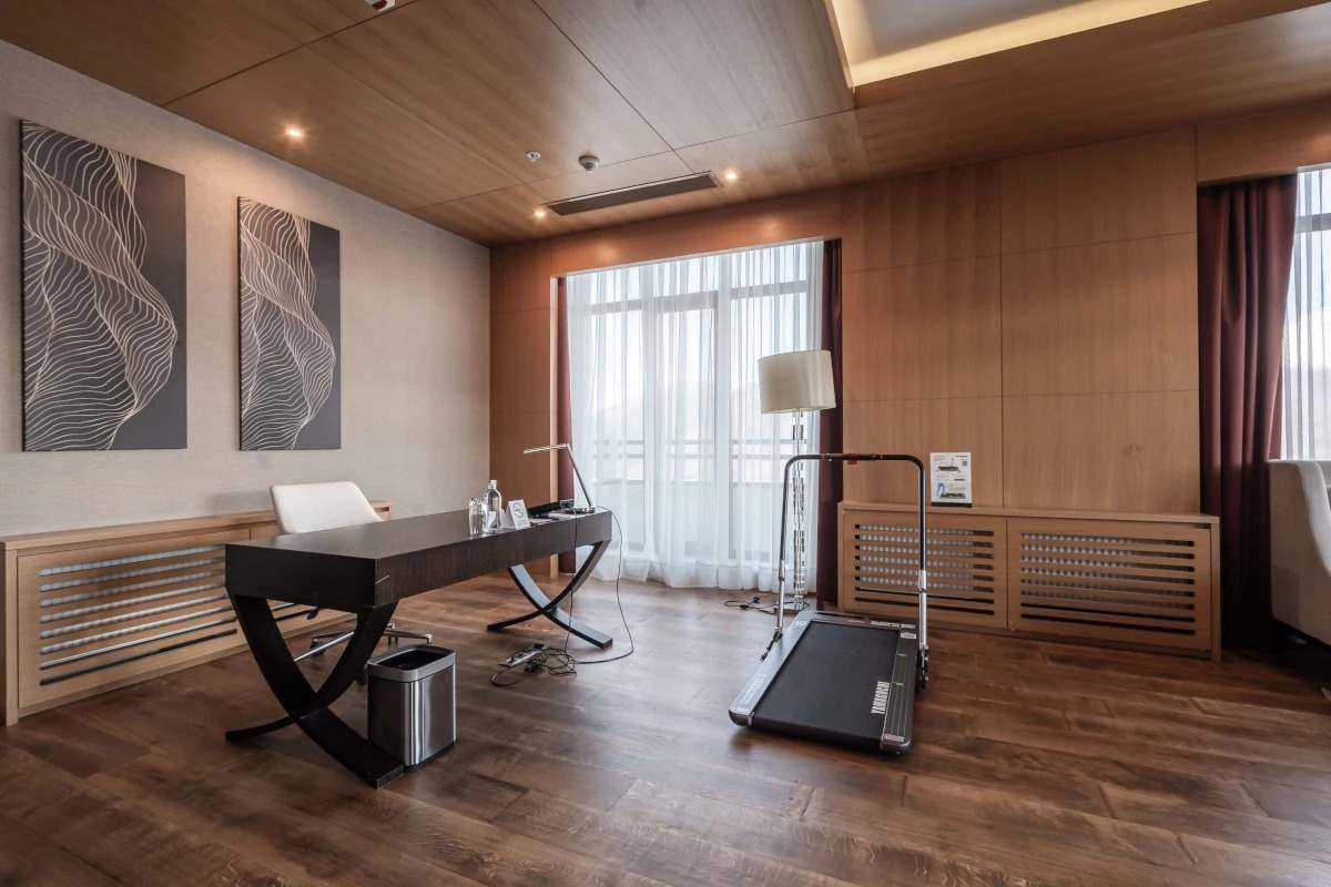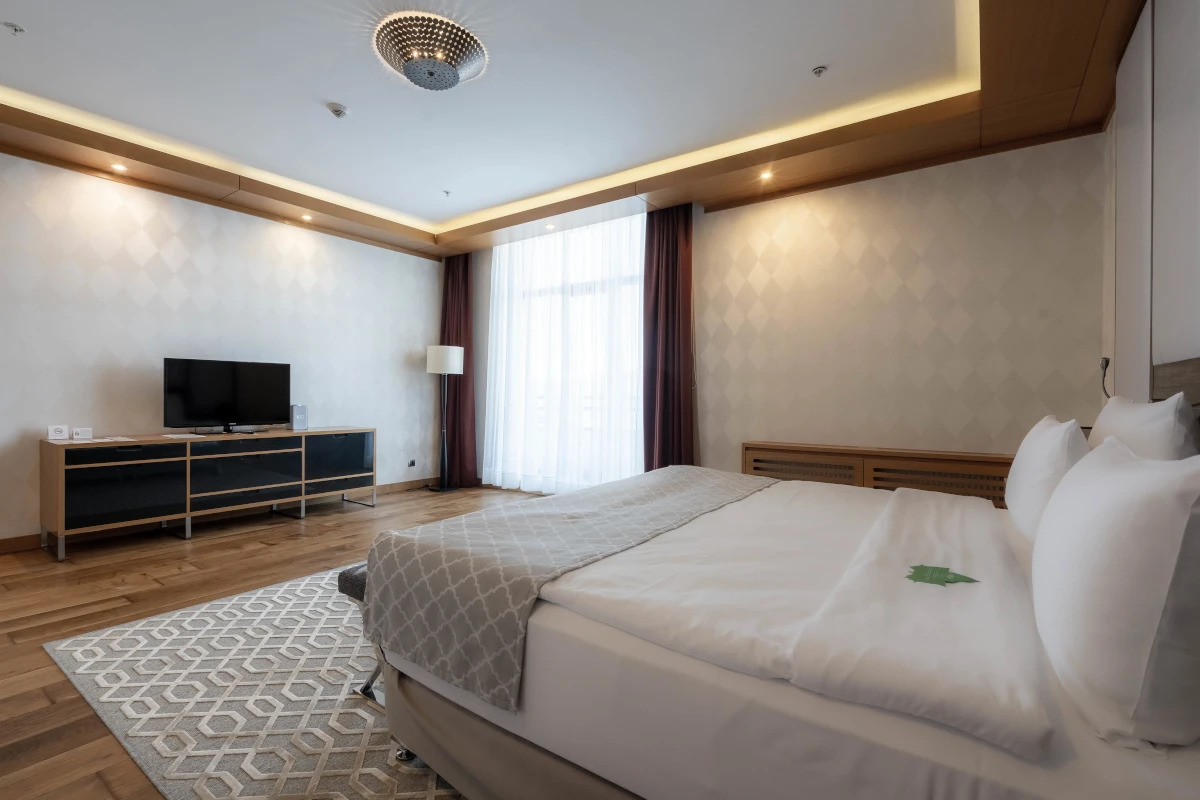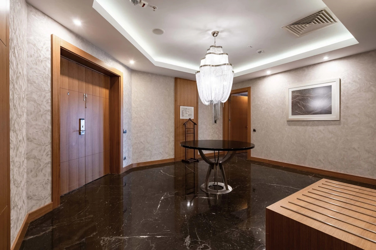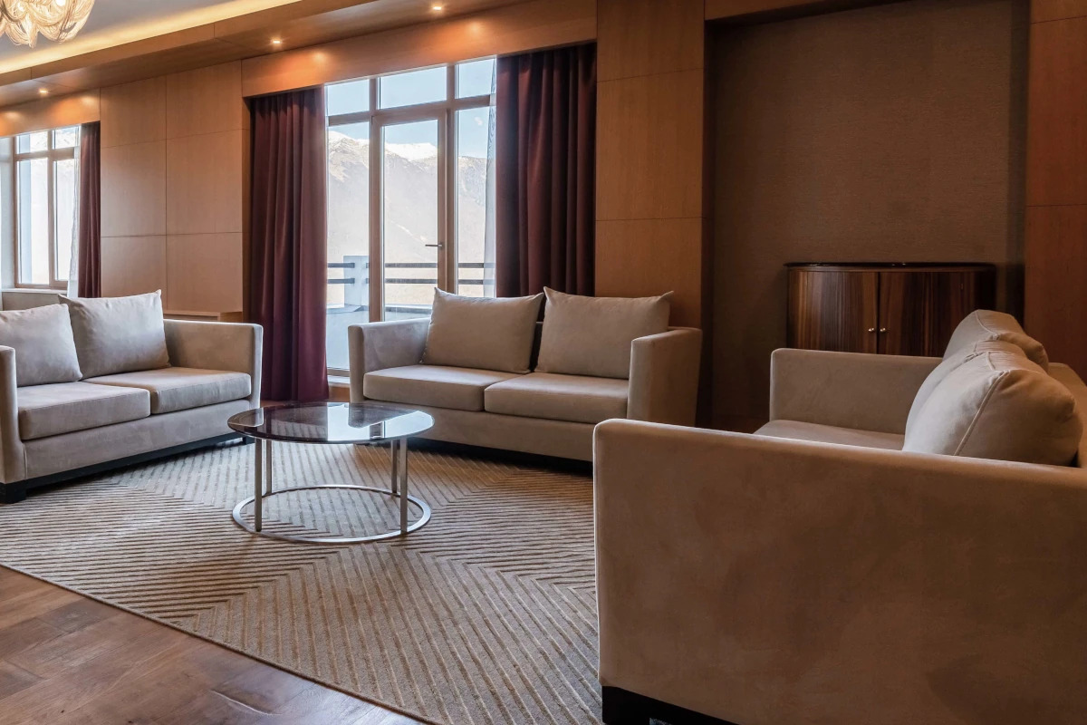 Номер состоит из спальни, гостиной, собственной кухни, столовой на 10 персон и рабочей зоны.